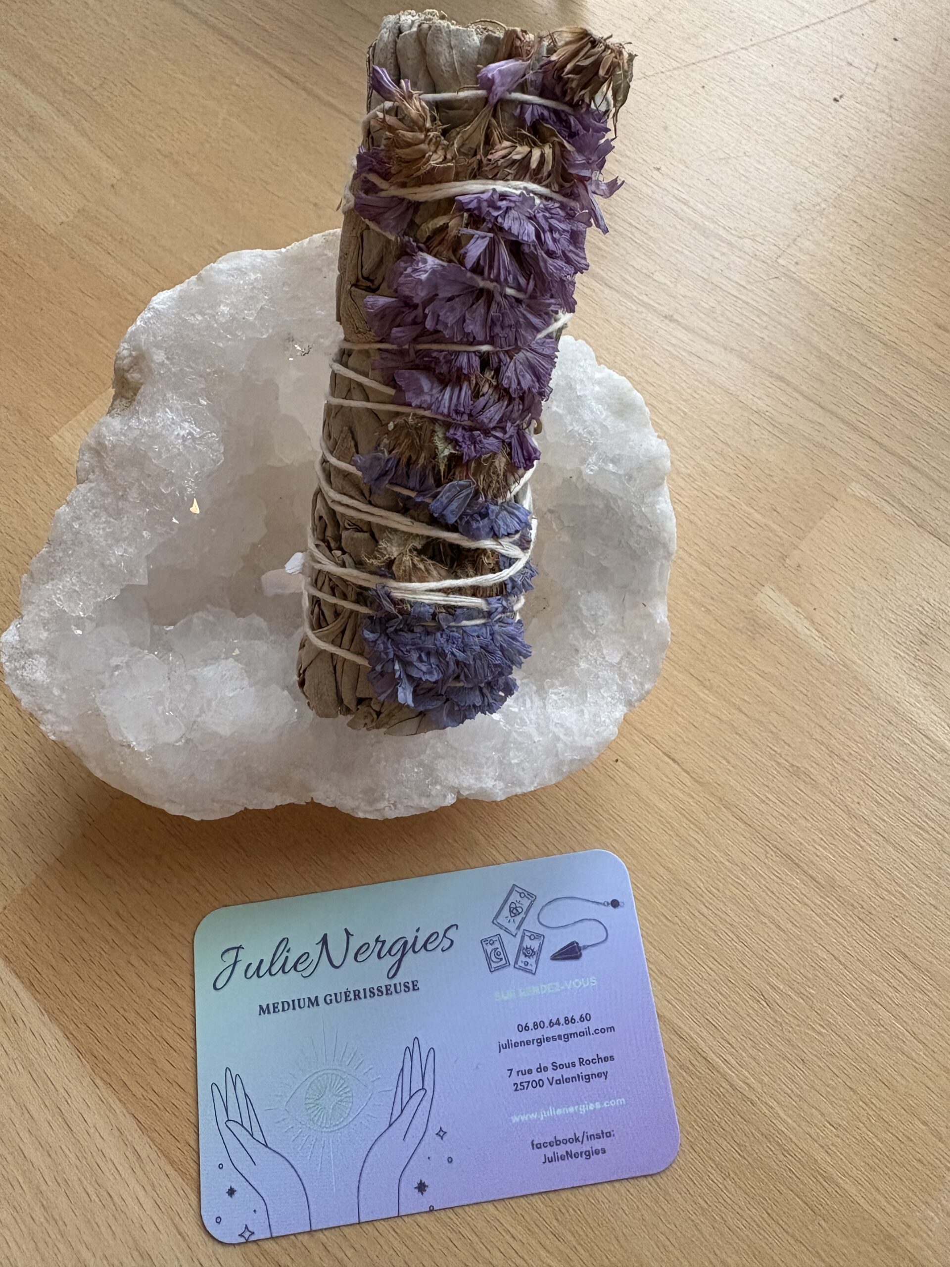 Le bâton de fumigation est composé de sauge blanche et de fleurs séchées. Il est utilisé en fumigation pour purifier les lieux, les objets énergétiquement et assainir l’atmosphère.