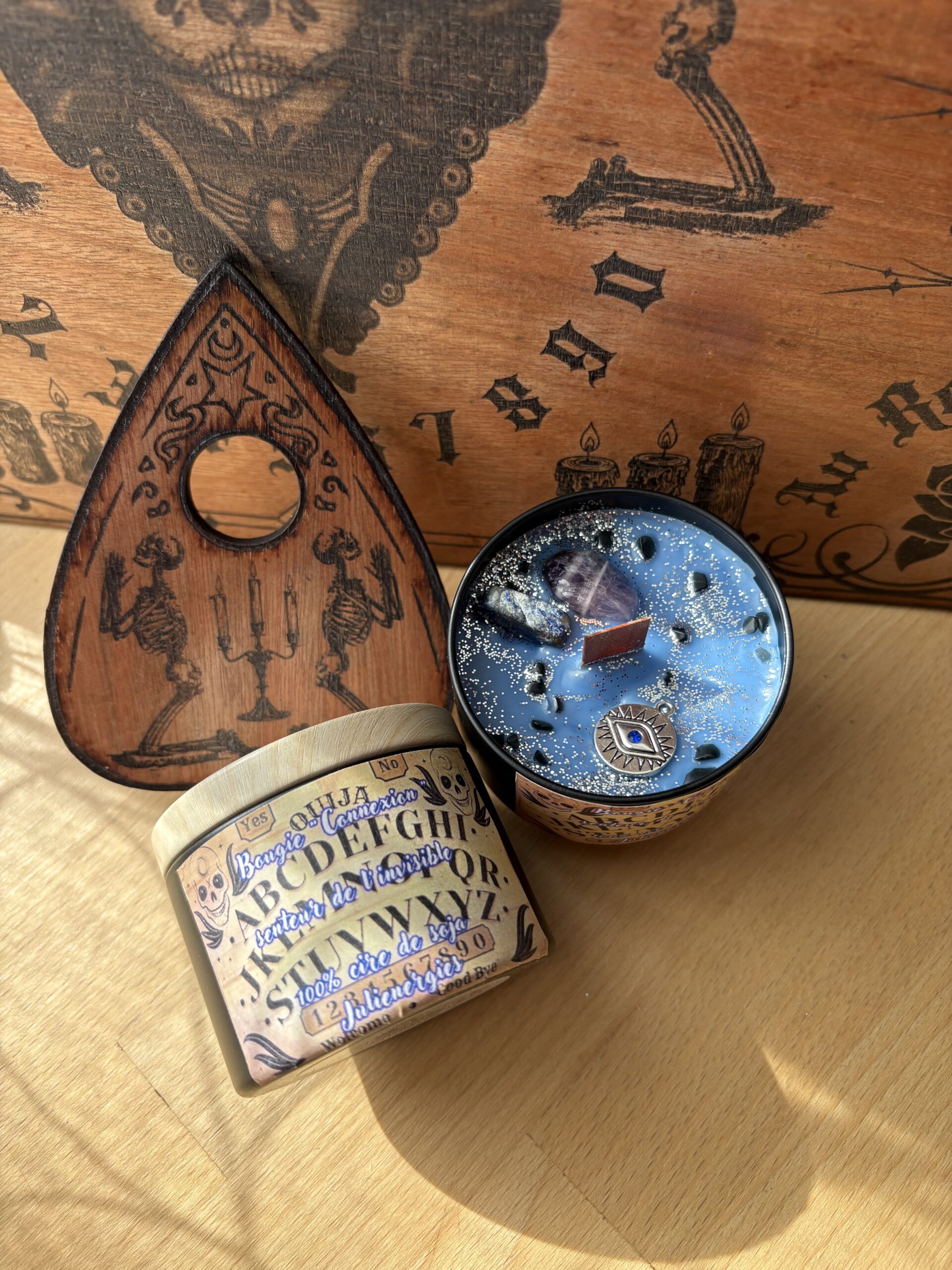 Fabriquée à la main cette bougie bien être , se démarque par la couleur indigo pour le 3eme œil.